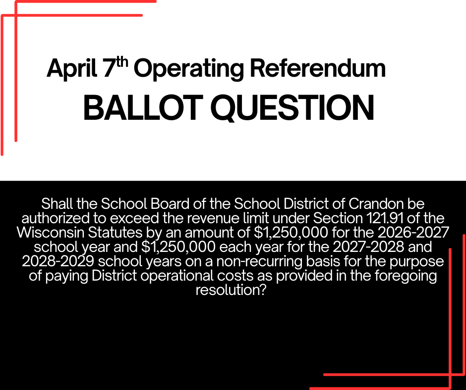 On the upcoming referendum ballot on April 7th, 2026, our community will have the opportunity to consider a proposal to sustain existing school operations. This referendum is intended to support what is currently in place, not to expand programs or construct new facilities, while supporting careful, long-term financial planning.